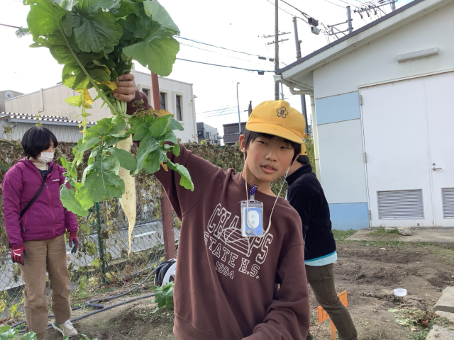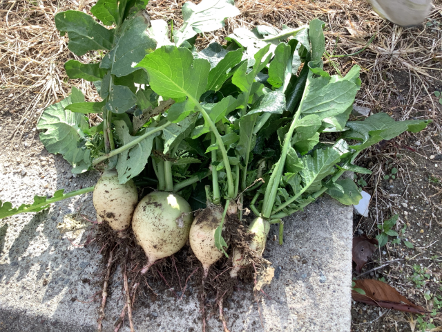 力いっぱい引き抜くと、立派に育った大根やカブが姿を現しました。