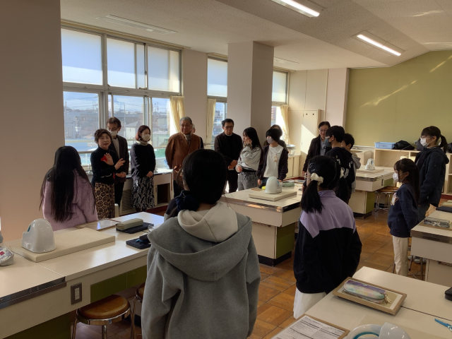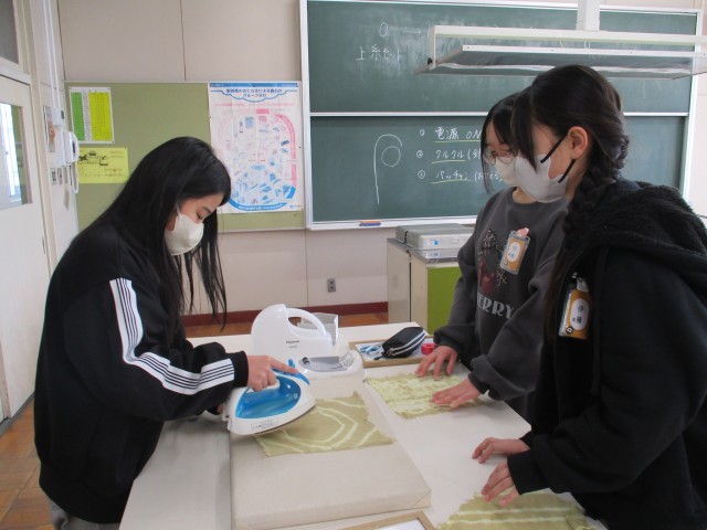 2月9日(月)、にしび夢のかけ橋実行委員会の方々にご協力いただき、先日絞って染めていただいた布をほどいてアイロンがけをし、額に入れました。