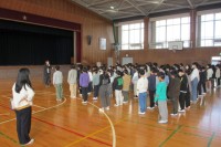 児童は、担任引率のもと防災頭巾をかぶり、「お(おさない)・は(はしらない)・し(しゃべらない)・も(もどらない)」をきちんと守り、決められた避難経路を通って、整然と避難することができました。