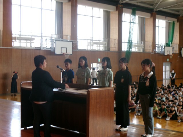全校朝礼を行いました。初めに、後期の児童会役員と学級委員の任命を行いました。名前...