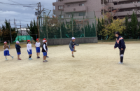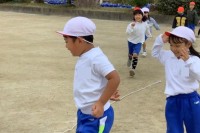 体育で長縄を始めました。初めての児童も多かったので、まずは縄を跳び越すことに慣れるよう、低い位置の縄を跳び越したり、真ん中で跳べるように置いた縄の真ん中でジャンプしてみたり、8の字跳びの通り道を覚えたりと基本を覚えてからスタートです。回る縄のどのタイミングで入れば良いか、みんなでかけ声をかけながら跳びました。