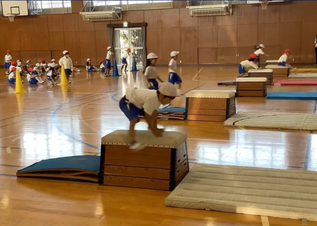 体育で跳び箱の学習をしました。1年生の跳び箱の学習は、跳び越すというよりは、跳び箱を跳ぶために基礎の動きを学習することが主な内容です。踏み切りが上手くできるように両足ジャンプの練習をしたり、手のつく位置を覚えて、跳び箱に乗ってみたりと体の使い方を学びました。コツを覚えて、次年度に行う跳び箱を跳び越す学習に繋げていきたいと思います。