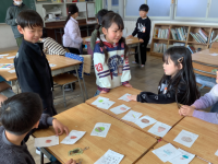 算数の学習では、「おおきさくらべ」を学習しています。2本の鉛筆や2本の紐の長さの比べ方を考えて端をそろえることを覚えたところで、ハンカチやノートの縦と横の長さ比べはどうやってくらべようと応用問題にも取り組みました。