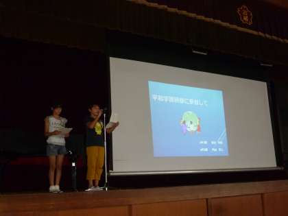 始業式の後、8月5日・6日に行われた広島平和学習の活動報告をしました。広島平和記念公園の中にある資料館や原爆ドームを見学したり、記念式典に参列したりした体験から二度と同じ歴史を繰り返してはいけないことを感じ、発表しました。