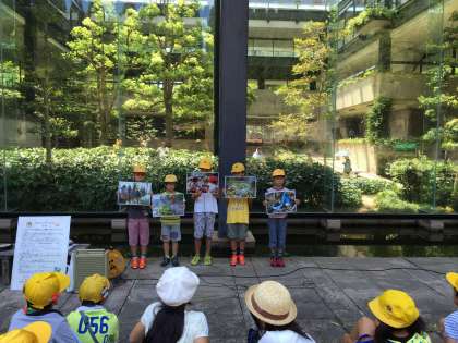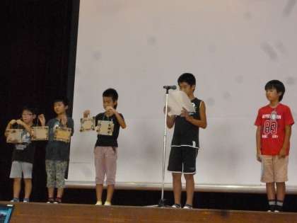 2学期の始業式のあと、「みどりの学習教室」での活動報告を行いました。7月28日に豊田市の緑化センターに行きました。各地から参加した小学校の緑化活動の話を聞いたこと、清須市内の代表校として学校紹介をしたこと、自然の木の実や植物を使ってフォトフレームを作成したしたことなどを報告しました。今年は男子5人での参加でした。数人ずつ他の学校のグループに加わって一緒に活動できたことで、知らない学校の話もたくさん聞けたり、友達になったりすることができました。自然の中でたくさんの緑にふれることで、とてもさわやかな気持ちになることに改めて気付いて、古城小学校にある「古城の森」やたくさんの緑も大切にしていきたいな、という声が聞かれました。