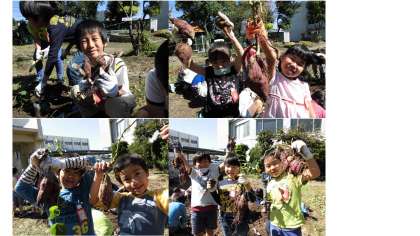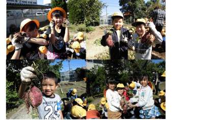 「こんなに大きいのがあったよ!」「こっちは、おいものあかちゃんみたいだよ!」あちこちから、子どもたちの嬉しそうな声があがります。大きな大きなサツマイモを、仲良く二人で協力して掘る姿もありました。