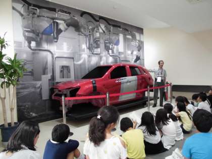 三菱自動車岡崎工場では、見学専用コースから、溶接ラインや組立ラインを間近で見ることができ、車の生産工程を学びました。子どもたちは、ロボットや無人で動く台車など、たくさんの機械に圧倒されていましたが、工場の方の説明を真剣に聞き、自動車工場についての理解が深まりました。