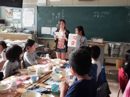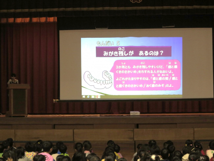 11.11 保健委員会「ハ・は・歯のクイズ」 公開日 2015/11/13 更新日 2015/11/13 お知らせ 保健委員会では、全校のみんなに歯についてもっと知ってもらおうと、「ハ・は・歯のクイズ」をしました。各学級をまわり、クイズのやり方などを説明したので、たくさんの人が参加してくれました。少し難しいクイズでしたが、みんなとても一生けんめいに考えてくれて、うれしかったです。古城っ子集会で、クイズの答え合わせと説明をしました。これからも楽しくてためになる集会をしたいと思います。