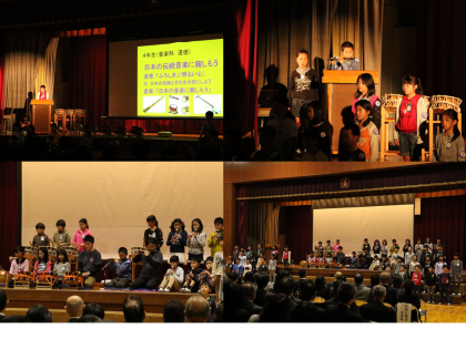 4年生は、「ともに生きる社会を考えよう」「日本の伝統音楽に親しもう」というテーマで発表を行いました。これまで練習してきた成果を発揮し、立派な演技を披露することができました。