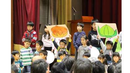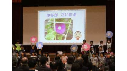 1年生は1学期から夏休みにかけて、大事に育てていたアサガオの成長について発表をしました。初めての大舞台で少し緊張した様子の子どもたちでしたが、たくさんの人たちの前で大きな声で堂々と発表し、元気いっぱいとびきりの笑顔で歌うことができました。