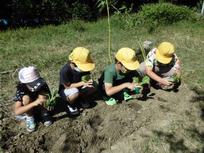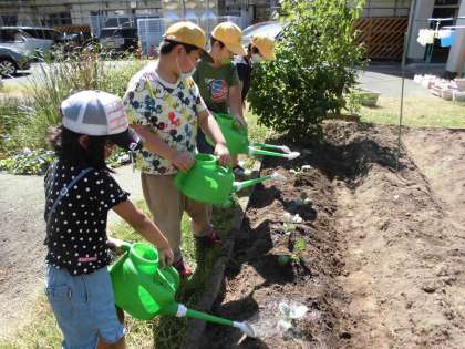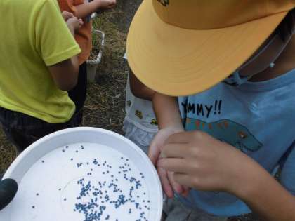 朝晩涼しくなってきて、いよいよ畑では冬野菜の準備をする時季になってきました。昨日と今日とで青首大根と紅芯大根の種をまき、ブロッコリー、カリフラワー、白菜の苗を植えました。あまりにも種が小さくて、子どもたちはびっくり!小さな苗を小さな手のひらにのせて、やさしく土をかけました。たっぷり水やりをしながら、「はやく大きくなってね」と声をかけました。