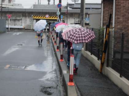 雨が降っています。一列で、安全に気をつけて登校しています。
