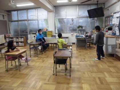 朝の会でスピーチをしています。内容は、お寿司を食べた話でした。