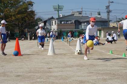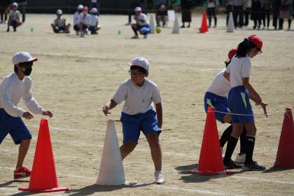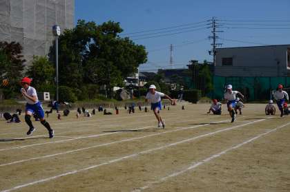 「今、一つになろう(障害物リレー)」と「徒競走」の様子です。