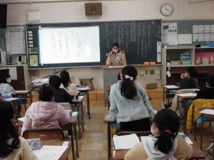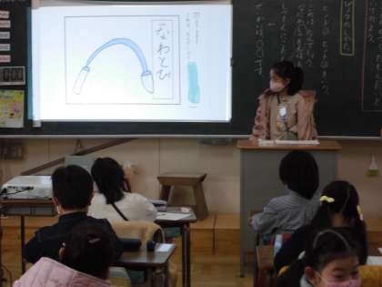 「ともだちがつくったもんだいをといてみよう」というめあてで取り組んでいます。一つ目のヒントを出し、次に二つ目のヒントを出して考えてもらい、質問を受けて最後に答えを伝えています。