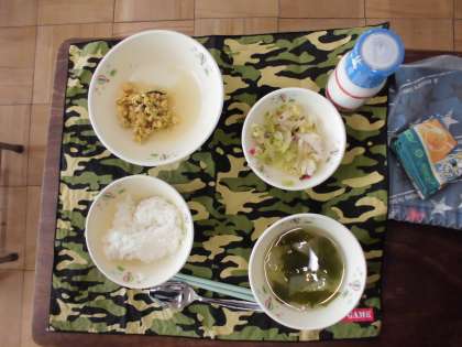 献立は、ごはん・牛乳・親子丼・梅あえ・すまし汁です。