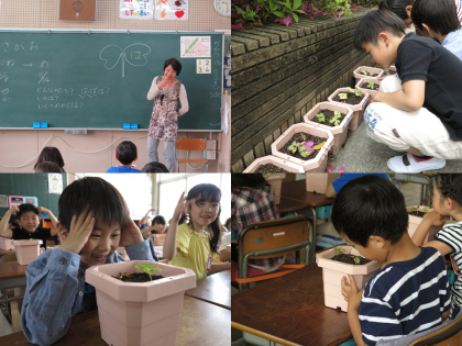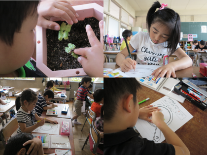 5月14日 芽が出たよ♪ 公開日 2013/05/15 更新日 2013/05/15 1年生の部屋 先週まいたアサガオの種が、今週にはもう芽が出ました。さっそく1組では観察をしました。目で見たり、手で触ったりして、アサガオの様子を確かめました。 その後、観察記録を書きました。葉の形、茎の色などしっかり観察していました。 毎日、アサガオとたくさんお話しすれば、すくすく成長してくれますよ!
