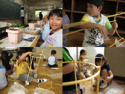 また、本葉が出てきたアサガオに支柱を立てました。支柱の組み立てに四苦八苦しながら上手に組み立てていました。