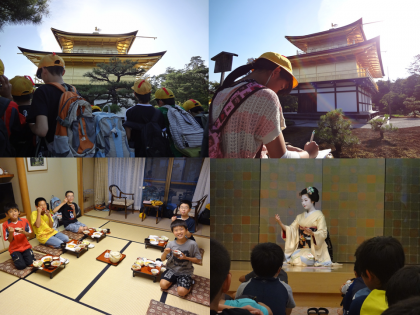 一日目の最後は光り輝く「金閣寺」でした。鏡湖地に映る逆さ金閣寺は絶景で、子どもたちは感激していました。