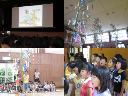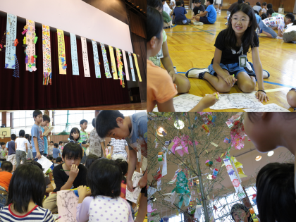 七夕集会を行いました。体育館に笹を3本立てたので、とても迫力がありました。