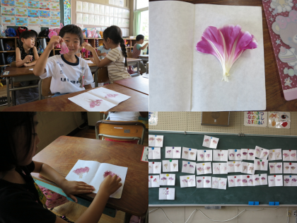 1組では、大きく育ったアサガオを使ってたたき染めをしました。和紙の上にアサガオの花を置き、2つに折って和紙に花の形が写るよう、手や水筒などを使い上から押しました。和紙を広げると、とてもくっきり写っており、子どもたちは喜んでいました。