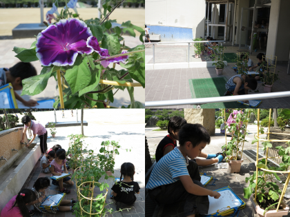 2組では、成長したアサガオの観察をしました。特につるが成長していて、「ぼくの身長より大きい。」と言いに来る子もいました。