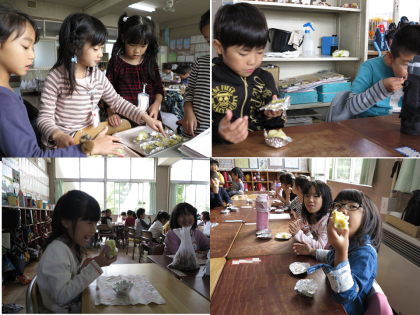 先週収穫したさつまいもを先生が料理し、「蒸しパン」と「大学いも」ができました。さっそく、各クラスでいただきました。