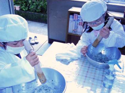 よもぎ餅作り 公開日 2014/04/23 更新日 2014/07/29 456組の部屋 わくわく広場のよもぎをみんなで摘み、よもぎ餅を作りました。餅米に少し白米を加えて棒で突きました。手軽にできる簡単な「よもぎ餅」で、きなことあんこをつけて食べました。みんなで作ったお餅は最高においしかったです。