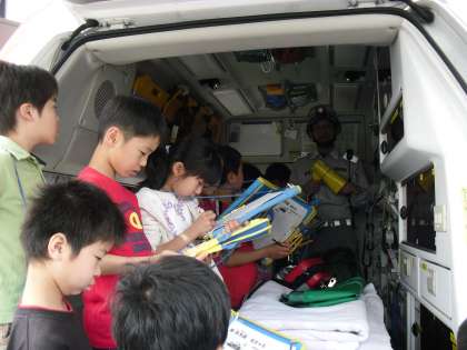 通信指令室やさまざまな種類の緊急車両をまじかで見せていただきました。わかりやすい説明に子どもたちは興味津々で聞き入っていました。