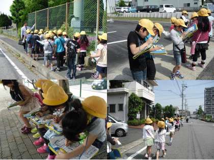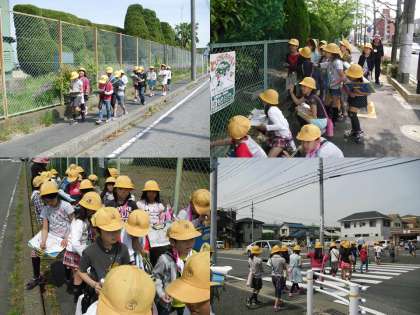 社会科の学習で、北コース・南コースに分かれて「まちたんけん」をしました。これは自分たちの住んでいる地域の特色や土地の様子、主な公共施設や古くから残る建物などを調べる活動です。子どもたちは、発見したことなどを記録しながら探検をしました。