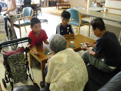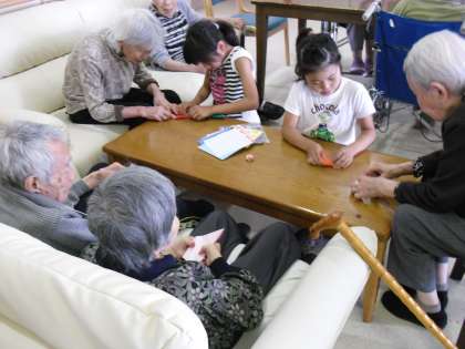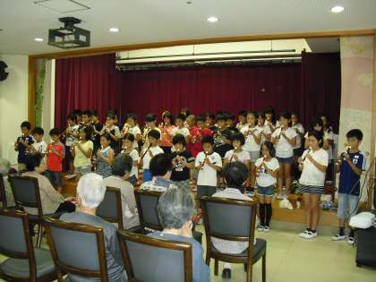 4年生 6/26(水) 「庄内の里」交流会 公開日 2014/06/26 更新日 2014/06/26 4年生の部屋 総合的な学習の時間の一環として「庄内の里」へ行ってきました。まずはじめに「ふるさと」の合唱と「とんび」のリコーダー演奏を披露しました。その後はグループに分かれて、おじいちゃんやおばあちゃんたちとお話したり、昔の遊びをしたりして交流させていただきました。あちらこちらで楽しい笑い声や、やさしい笑顔があふれていました。