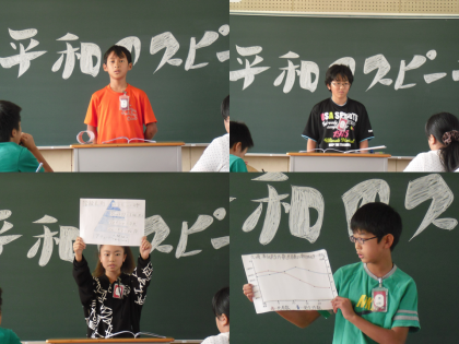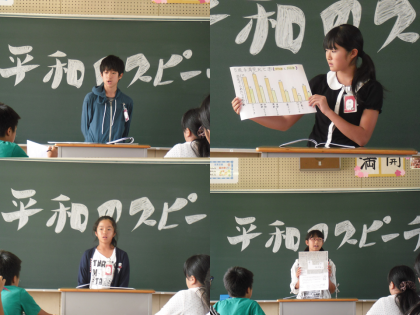 学級で題材を考え、各自で図書室やパソコン室の資料を活用し、自分の意見を確定させました。子どもたちは、一人一人が平和について真剣に向き合い、意見文を完成させました。その後、一所懸命に練習に取り組み、スピーチ会を迎えました。