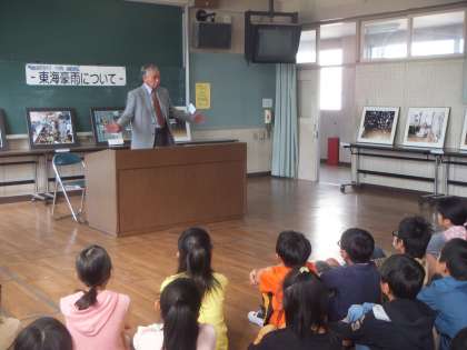 5年生では、総合的な学習の時間で「防災」について調べ学習を行っています。    夏休みには、「東海豪雨」について調べました。                  今回、清須市教育委員の堤忠正先生を講師にお迎えし、「東海豪雨」についてのお話を聞きました。大雨が降って堤防が切れたときの町の様子や避難所での生活について、自分たちが感じていた以上に大変だったということが分かりました。堤先生のお話を通して、これまで以上に普段からの備えが必要であることを実感しました。