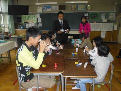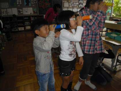 4・5・6組は2時間目に合同で万華鏡を作りました。チョコレートの空き箱や身近なものを使って、万華鏡のしくみを学びながらの作成となり、三角柱をのぞいて子どもたちが歓声を上げる場面が多く見られました。途中から保護者の方にも参加していただき、6人全員がそれぞれ思い思いの万華鏡を作ることができました。