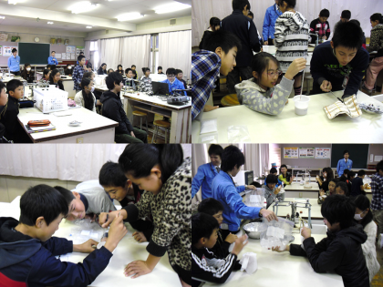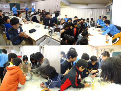三菱重工の方々をお招きして、理科出前講座を行いました。「温め方・冷やし方」というテーマで様々な実験を行いながら勉強することができました。実験の最後には、グループで協力してアイスクリーム作りを体験しました。