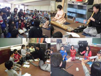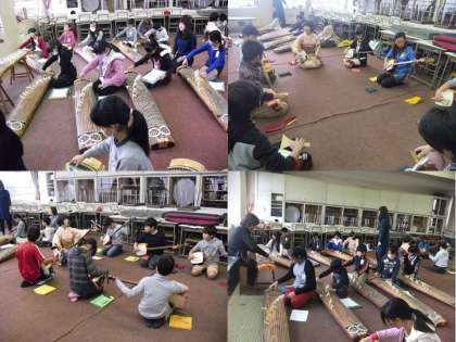 12月4日、2時間目から4時間目に、箏・三味線演奏家の大久保智子先生と尺八演奏家の渡辺峨山先生をお迎えし、音楽の授業として「いろはに邦楽」を行いました。先生方の「春の海」の生演奏のあと、箏、三味線、尺八などの伝統楽器の歴史についてのお話を聞きました。体験学習の時間もあり、伝統楽器に触れることができました。最後に、講師の先生方からは、今日の体験を忘れずにこれからたくさんの人に伝統音楽を広めていってほしいとお話がありました。