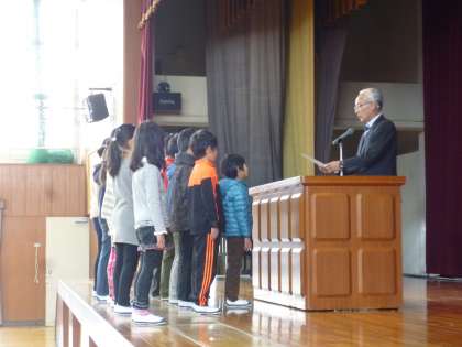 12月22日、体育館にて2学期終業式が行われました。先週行われたマラソン大会の表彰の後、校長先生のお話を聞きました。校長先生からは、まず、2学期をふり返って、古城小学校の校訓『明るく・正しく・たくましく』、そして学校目標『みんな高め合い・みんな元気・みんな友だち』、さらにJRCの合い言葉『気付き・考え・実行する(行動する)』を心掛けて、この2学期運動会や作品展、マラソン大会などの行事を立派に成功させることができ、よく頑張りましたというお話がありました。また、自分自身の生活面や学習面については、今日担任の先生からいただく通知表をしっかりと見て振り返ってほしいと言われました。
