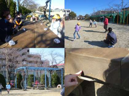 ちょっぴり北風が吹いていましたが、穏やかな日差しの中、4・5・6組のなかまで40周年記念のお楽しみ会を開きました。藤棚の下に新しく設置された木製のテーブルとベンチに集まり、アップルパイを食べました。大きいテーブルには、木の節がたくさん見られ、思わず年輪を数えてみたら、なんと!樹齢98年の木だということが分かって、みんなでびっくり。食べた後は、運動場で「しっぽ取り」や「グルグルじゃんけん」をして思い切り体を動かしました。明日から暦の上では春。少しずつ暖かくなっていくといいね、と話をしました。