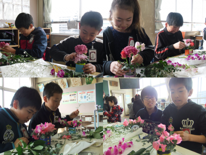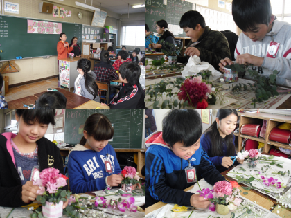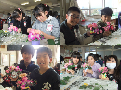 6年生は、1・2限に花育ティーチャーを招いて、花育教室を行いました。はじめに、愛知県が全国1位の花の生産量であることや、季節ごとに楽しめる花などについての説明を受けました。子どもたちは、知らなかったことが多く、驚いた様子でお話を聞いていました。