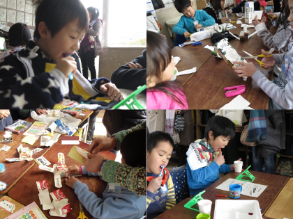 その後、来週行う、「新入学児体験入学」のためのプレゼント作りを行いました。保護者の方に手伝っていただき、上手に作ることができました。
