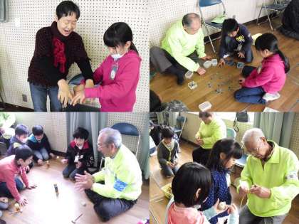 後半は、昔の遊びを教えていただきました。子どもたちは、お手玉やあやとり、けん玉など7つの遊びを体験しました。講師の方にコツを教えていただき、できるまで頑張っていました。なかなかうまくできない子どもたちに優しく声をかけてくださったり、成功したときには一緒になって喜んでくださったり、子どもたちは楽しみながら学ぶことができました。