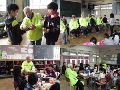 3・4時間目から給食の時間が終わるまで、地域のお年寄りの方々を講師としてお招きし、三世代交流会を行いました。