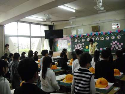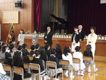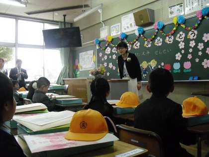 今日は入学式でした。きれいに舞う桜とともに、元気な60名の1年生が登校してきました。受付でピカピカの名札をつけてもらい、うれしそうに教室の中に入っていきました。