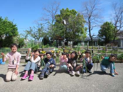 久しぶりの青空の中、わくわく広場でよもぎ摘みと新タマネギの収穫をしました。よもぎの新芽をつみながら、子どもたちからは「去年もとったよね」「今年は何を作るの」という言葉が返ってきました。その後、土からちょっぴり顔を出したタマネギにわくわくしながら、子どもたちは1本1本引き抜いていきました。大きいものからちょっと小さめものまでありましたが、みんなで力を合わせて収穫をしました。