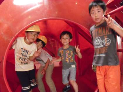 公園内にある愛知県児童総合センターには面白そうな遊具がいっぱいありました。1・2年混合のグループで、仲良く遊びました。工作やクイズに参加したグループもありました。