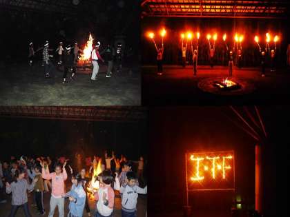 1日目、ほとんどの子が初めてのうどん作りで、生地を伸ばすことに苦労していましたが、思い思いのうどんが出来上がり、ゆで方もバッチリでみんな大満足でした。キャンプファイヤーでは、みんなの心がひとつになり、大盛り上がりのスタンツでした。トーチトワリングも練習の成果が表れ、息の合った幻想的なものでした。