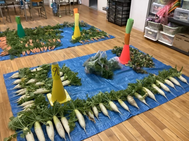 大根・人参・ねぎ・赤大根どれも無農薬の野菜たちです。前日に子どもたちが収穫したとき、ブルーシートが野菜たちで山盛りになってびっくり!当日は予定の時間より早くから並んでくださった保護者の方々の多さに子どもたちもびっくりしていました。