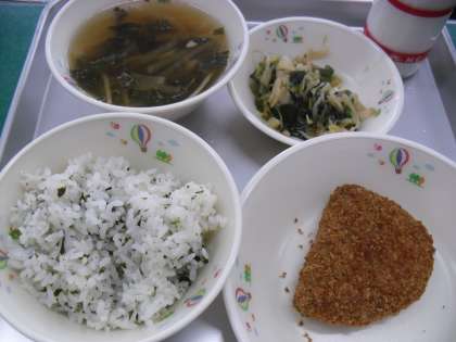 献立は、「かぼちゃのひき肉サンドフライ・沢煮わん・おひたし・わかめごはん・牛乳」でした。