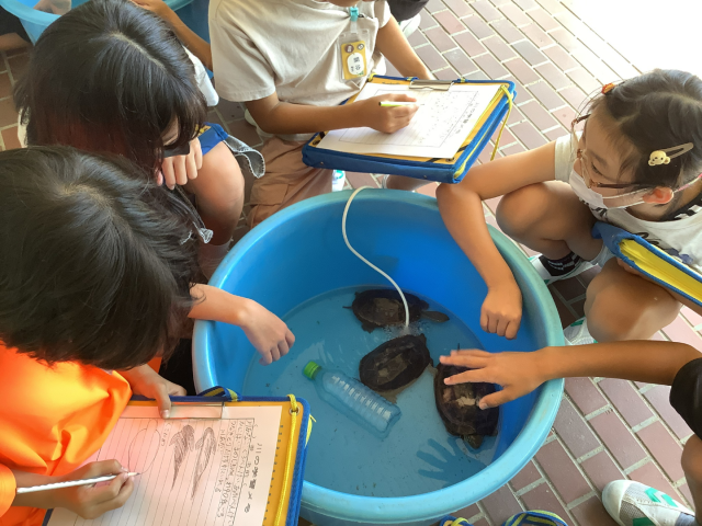 現在の川の様子を知ったり、庄内川に住んでいるウナギ、エビ、カニ、亀、魚などに触れたりしました。