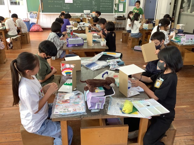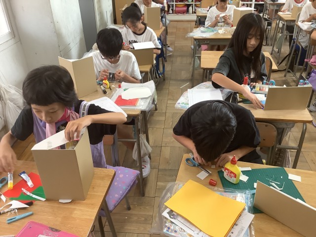 図工では、ミラクルミラーワールドという作品を作っています。鏡にうつして奥行きや広がりを考えながら、それぞれ思い描く作品ができるように工夫していました。みんなとてもよい作品ができました。